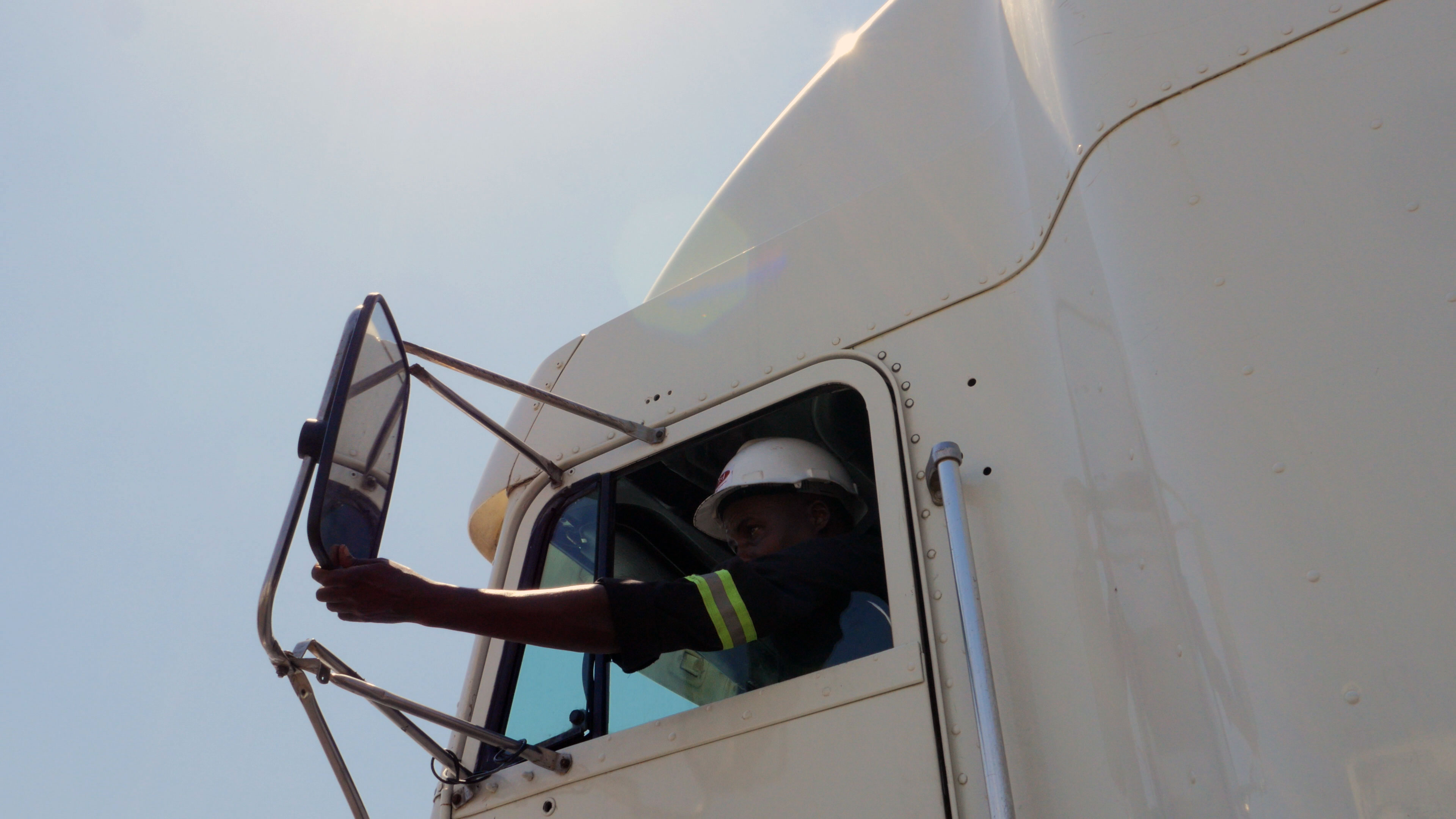 Our Senior Driver doing his pre trip checklist on his mirrors.